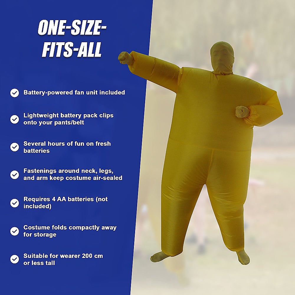 Perfect for Halloween and get-togethers all year-round, this costume is one size fits all for men and women. It's made from terylene, a lightweight polyester. Unlike latex or bulky cloth costumes, you'll keep nice and cool in this suit, and it won't weigh you down. A small fan keeps the costume inflated. The fan mechanism is small and hassle-free — just clip the battery pack (requiring 4 AA batteries, not included) to your pants or belt. You can have fun for hours with fresh batteries.